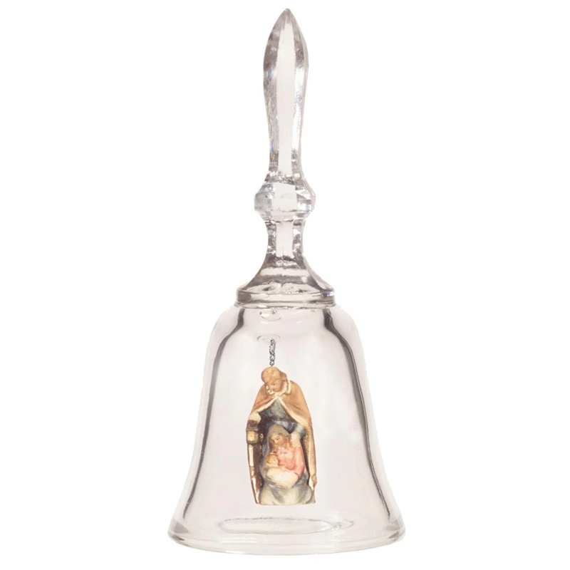 Diese elegante, 20 cm hohe Kristallglocke birgt eine hölzerne Krippe der Heiligen Familie im klassischen Barockstil und ist ideal für ein traditionelles und behagliches Weihnachtsfest.